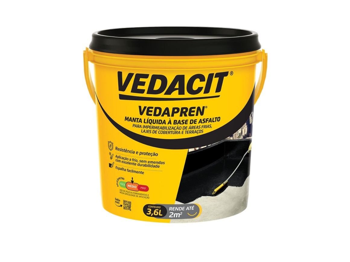 VEDACIT VEDAPREN é uma manta líquida, de base asfalto e aplicação a frio, pronta para uso e moldada no local. Cobre a estrutura com uma proteção impermeável. Apresenta ótimas características de elasticidade e tem grande durabilidade.